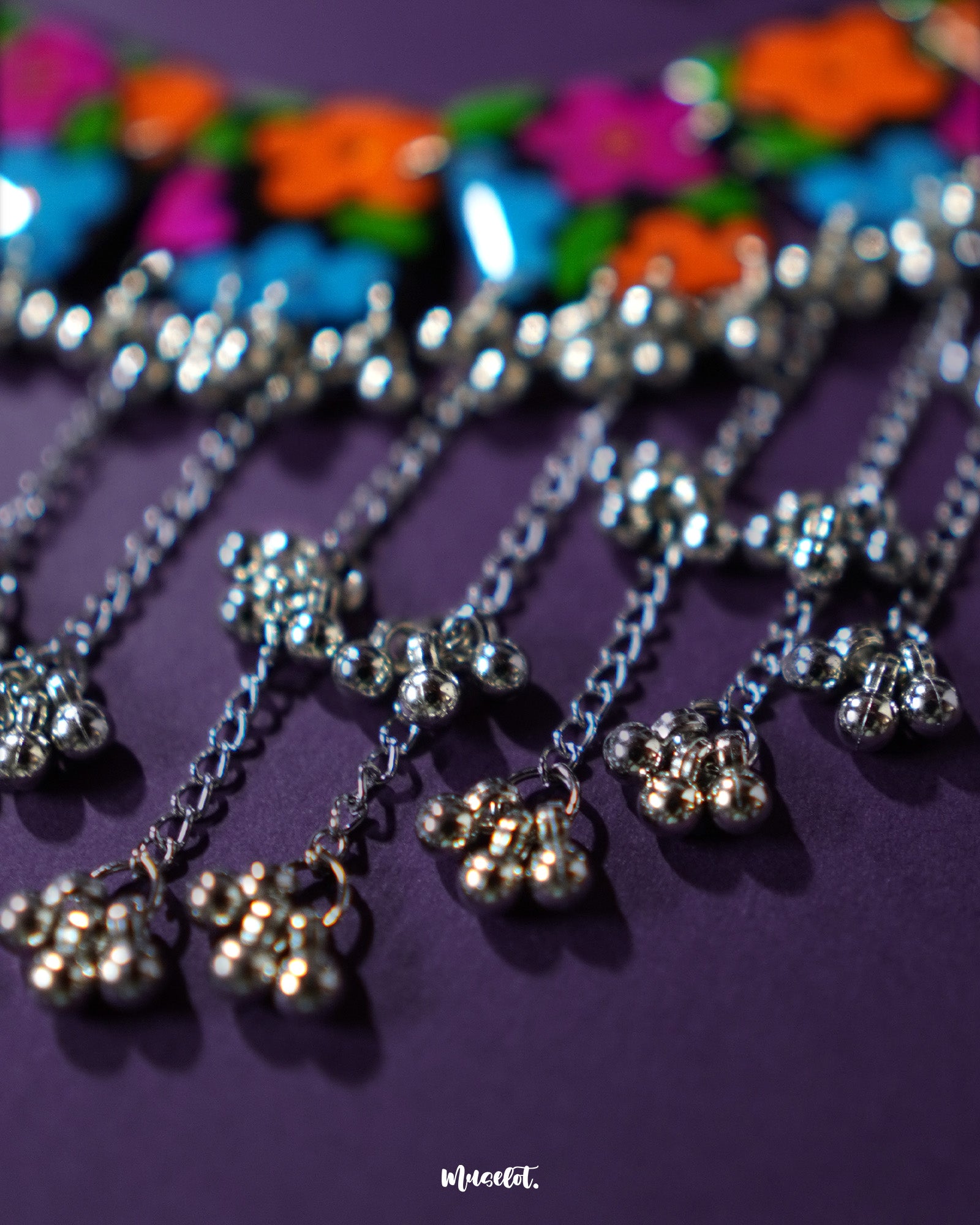 Baharaan jhumkas featuring playful crescents in green, yellow, and purple, highlighting festive charm and showcasing intricate beadwork with a handcrafted flair — Muselot.