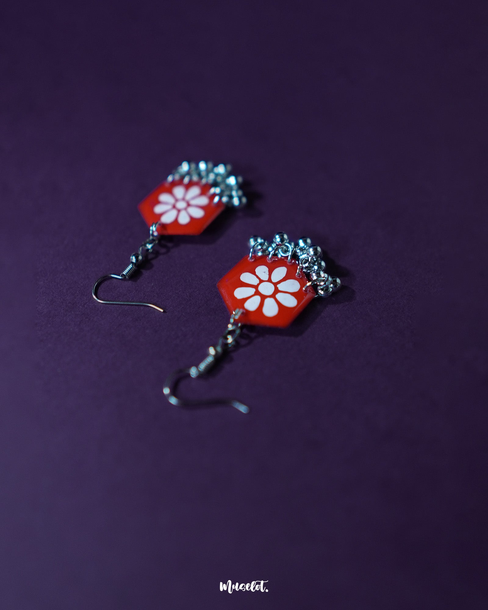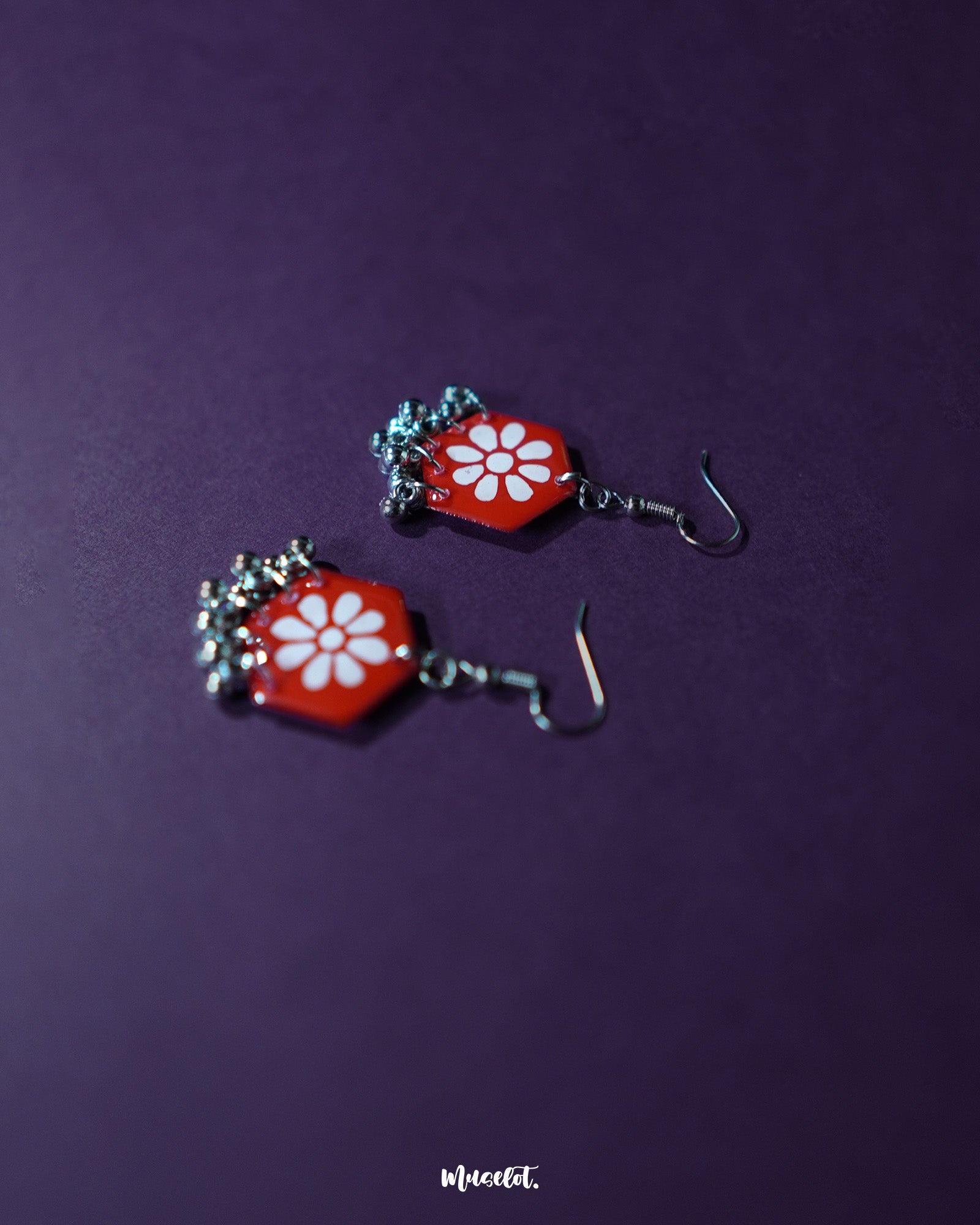 Hook Earrings glowing in red like a rare bloom or wild bird