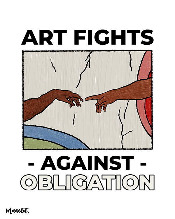 Make a bold statement with this illustrated poster featuring the text 'Art Fights Against Obligation'.