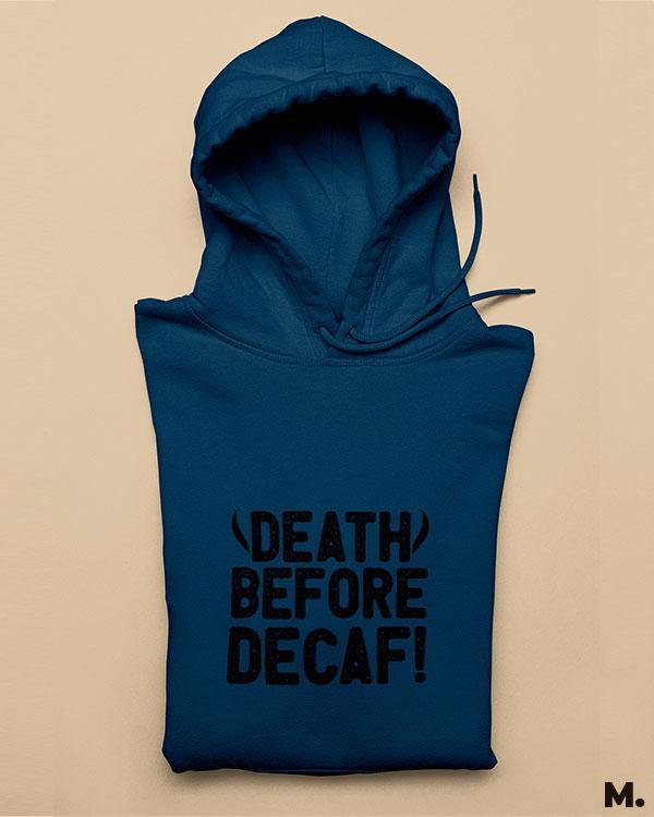 To prevent any such heart tearing affair, I confidently recommend putting on printed hoodies like this DEATH BEFORE DECAF hoodie, it promises zero probability of decaf thoughts and people around coffee fanatics.