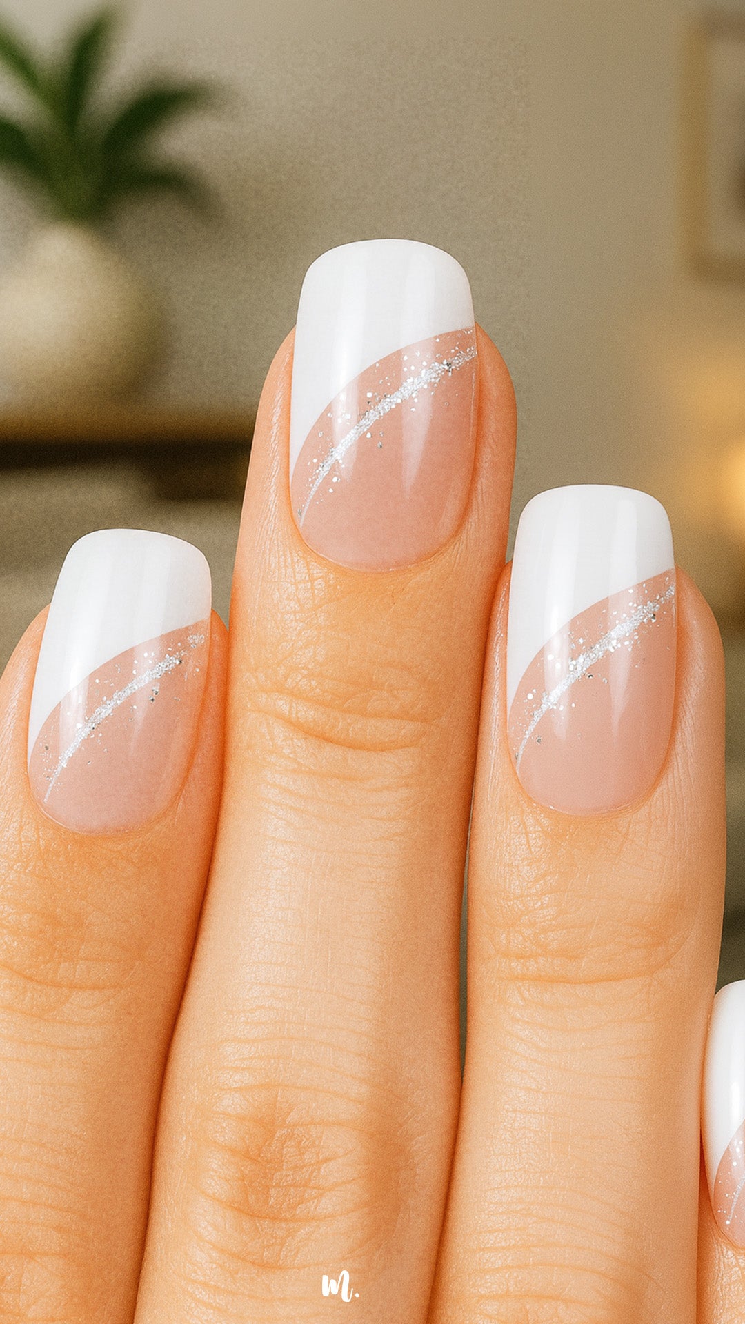 A French tip that ditched the straight line for something a little more fun. Crisp white, a sleek curve, and a dash of silver sparkle - like your nails are wearing their own little crescent moon. Classy, but not afraid to bend the rules.