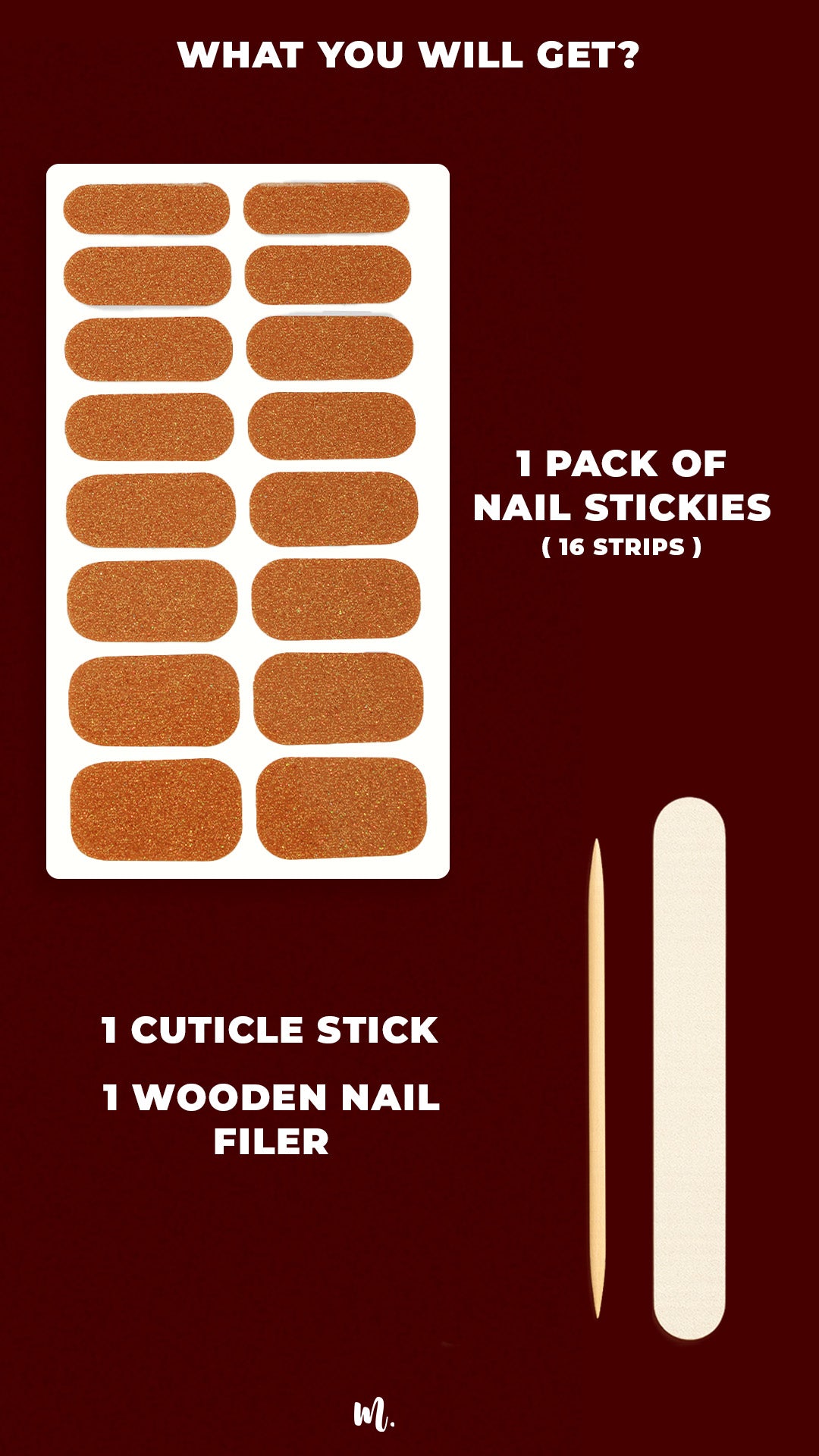 1 Nail Stickies - 1 Design includes 16 strips in varying nail sizes - Designed to fit most Indian nail shapes without trimming!